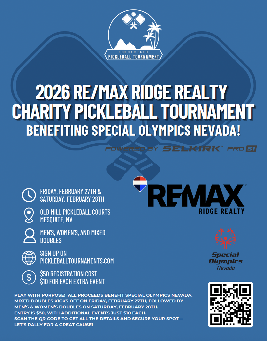 This tournament is for the benefit of Special Olympics Nevada. The focus of the tournament is fun, friendship, and charity. Net proceeds from this tournament will be donated to Special Olympics Nevada.The events will be divided into three major age groups (Open: 49 and under, Senior: 50-64, and Senior Plus: 65 and better) and four skill divisions (3.0 and below, 3.5, 4.0, and 4.5 and above)